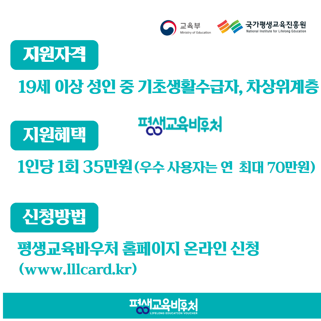 문의: 평생교육바우처 상담센터(홈페이지: www.lllcard.kr, 전화: 1600-3005)