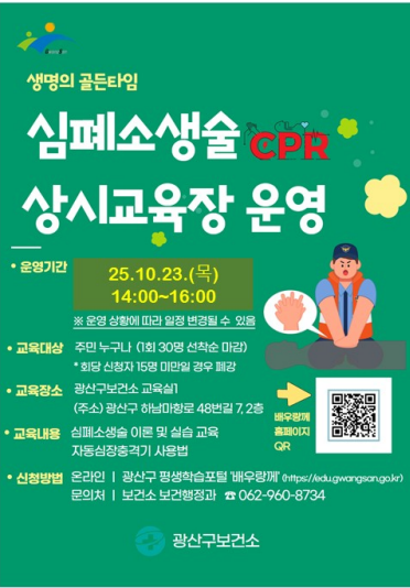 일시 : 2025년 10월 23일 목요일 14:00~16:00(2시간) 장소 : 광산구보건소 교육실1 (광산구 하남마항로 48번길 7, 2층) 내용 : 심폐소생술 및 자동심장충격기, 기도폐쇄 처치법 이론·실습교육 ※ 2시간 교육 후 수료증이 메일로 발급됩니다. (법정교육 수료가 필요하신 분은 미해당) 심정지와 같은 응급상황은 언제, 어디서든, 누구에게나 발생할 수 있습니다. 생명을 살리는 소중한 기술을 배울 수 있는 기회입니다. 심폐소생술 교육 많은 신청바랍니다 :) *** 교육 신청하신 분들은 점심 든든히 드시고, 편한 복장으로 방문해주세요!! |
