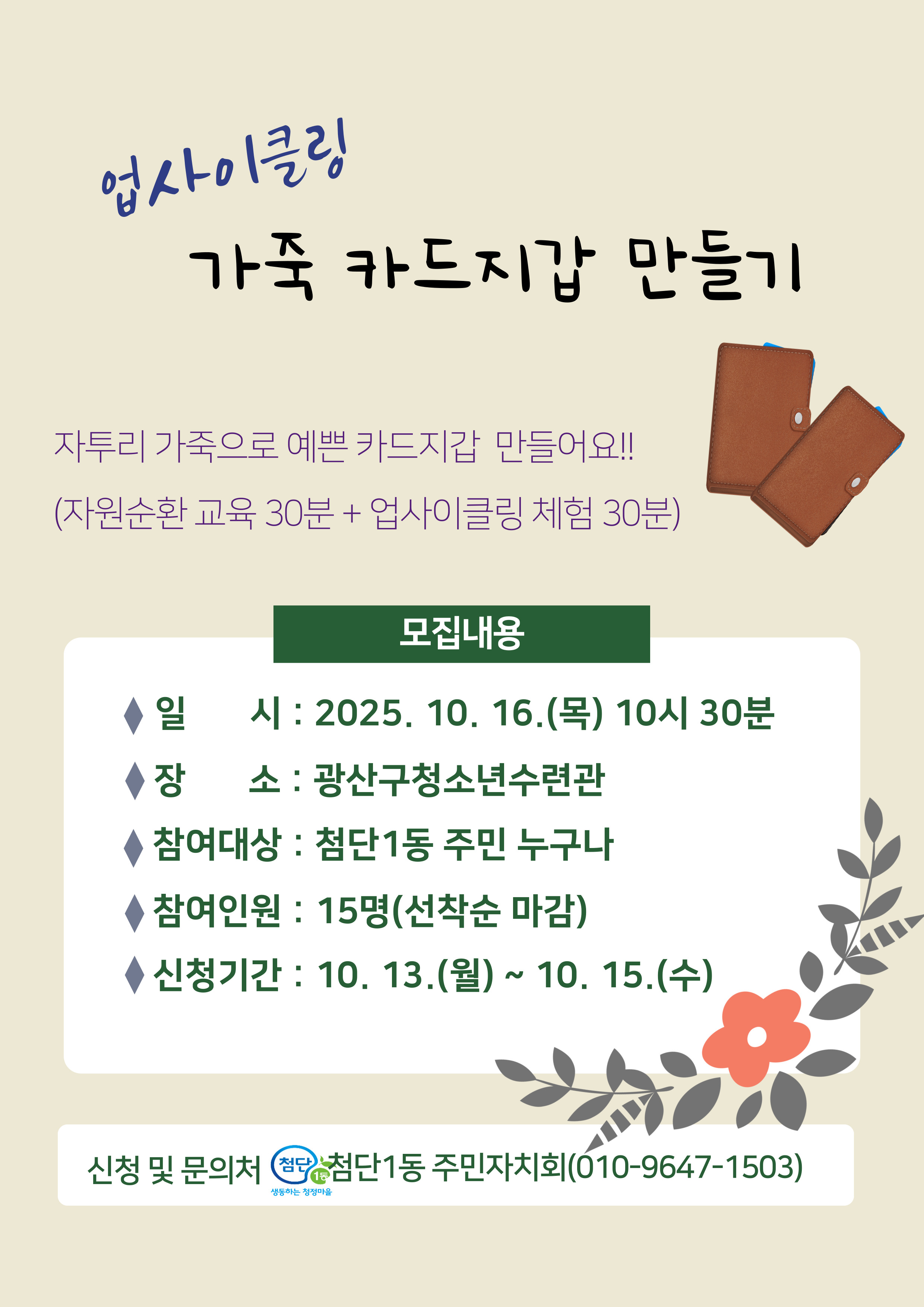 자원순환교육도 듣고 가죽 카드지갑도 만들어요 - 일시: 2025. 10. 16.(목) 10:30 - 장소: 광산구청소년수련관 1층 - 대상: 첨단1동 주민 누구나 - 인원: 15명(선착순) |