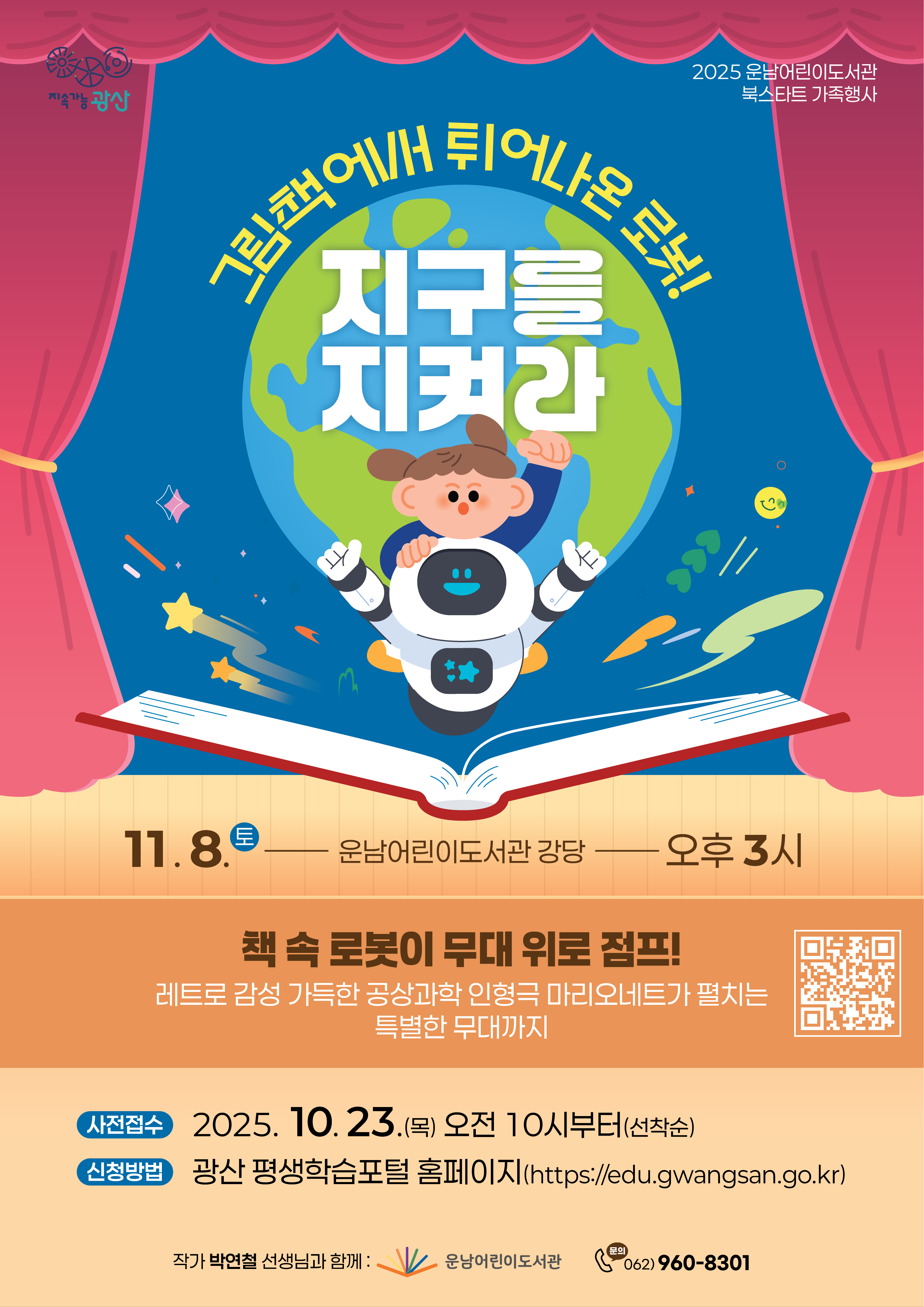 운남어린이도서관 북스타트 가족행사입니다. o 그림책 『지구를 지켜라』를 원작으로 한 레트로풍 공상과학 인형극입니다.(공연단체: 극단 간세쟁이) - 국내외에서 인정받은 그림책 작가이자 인형극 예술가인 박연철 작가의 레트로 공상과학 인형극과 마리오네트 시연 본 공연은 사전접수 60명, 현장접수 20명이 관람 가능합니다. *현장접수는 2025. 11. 8.(토요일) 14:30 부터 강당 입구쪽 데스크에서 받습니다. 미취학 어린이 및 초등 어린이, 가족 모두 관람 가능하며, 도서관내 혼잡우려로 인해 별도 출입구 개방 예정입니다. |