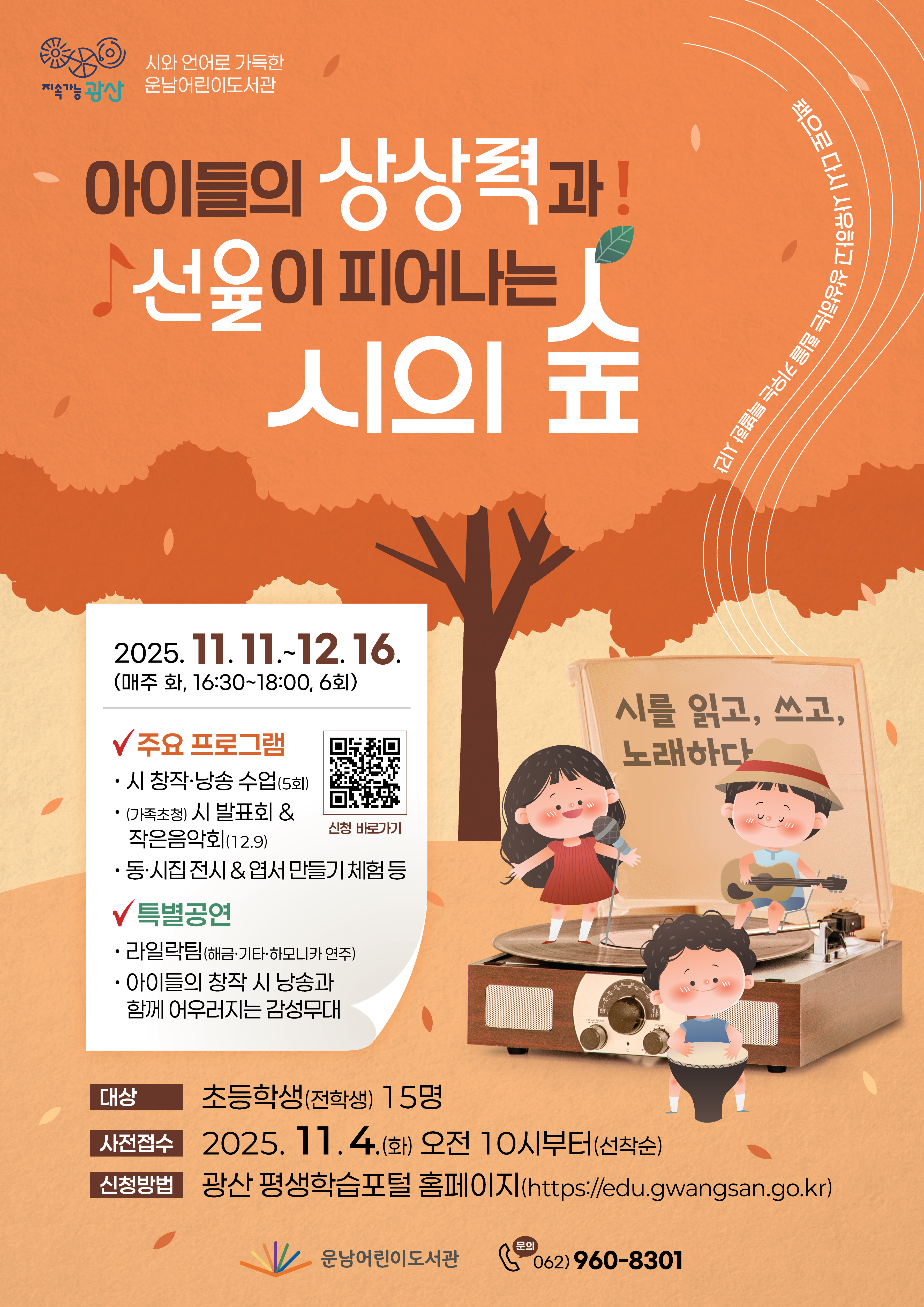 ● 신청방법 : 온라인 신청(광산평생학습포털 배우랑께) ● 기간 : 2025.11.11.(화)~12.16.(화) / 6회 ● 시간 : 매주 화요일 16:30~18:00 ● 장소 : 운남어린이도서관 강당 ● 대상 : 초등학생(15명) ● 내용 : 시 창작, 낭송 교육 - 동시 읽기 및 감상 - 시적 언어를 활용한 창작 활동 - 나만의 동시 쓰기 및 공유 - 창작 동시 낭송법 익히기 - 감정 표현과 목소리 훈련 |
