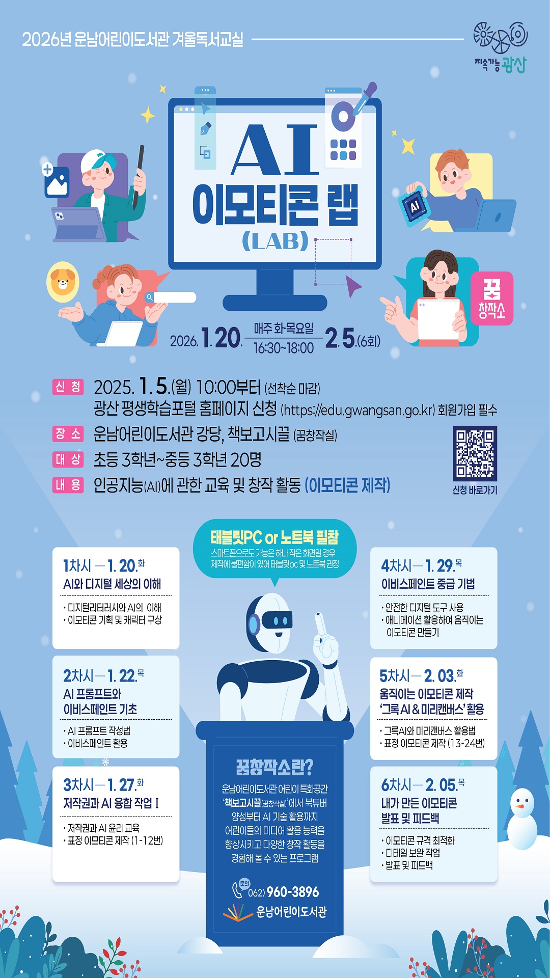 **수강하는 당사자가 평생학습포털 회원가입 후 신청해야합니다. ***어린이의 회원가입이 어려울 경우 보호자가 회원가입하여 수강신청 시 어린이를 반드시 추가(단체접수)해 주시기 바랍니다. (부모가 신청할 경우를 포함하여 총 40명으로 신청인원이 늘어난 상태이며, 부모제외 선착순 20명으로 제한됩니다) [2026년 운남어린이도서관 겨울 독서교실] 「AI 이모티콘 랩(Lab)」 ◾운영기간: 1. 20.(화) ~ 2. 5.(목) 6회 운영 ◾요일/시간: 화, 목요일 16:30~18:00 ◾장 소: 운남어린이도서관 강당, 책보고시끌(꿈창작실) ◾강 사: 임양선 ◾대상/인원: 초등 3~중등 3 / 20명 ◾내 용: AI리터러시 교육 및 창작물(메신저 이모티콘) 만들기 ◾준 비 물: 태블릿 혹은 노트북★★ (휴대폰으로 진행할 시 진행이 더디고 제작에 어려움이 있을 수 있어 태블릿 혹은 노트북을 권장합니다.) 문의전화☎062-960-3896 |