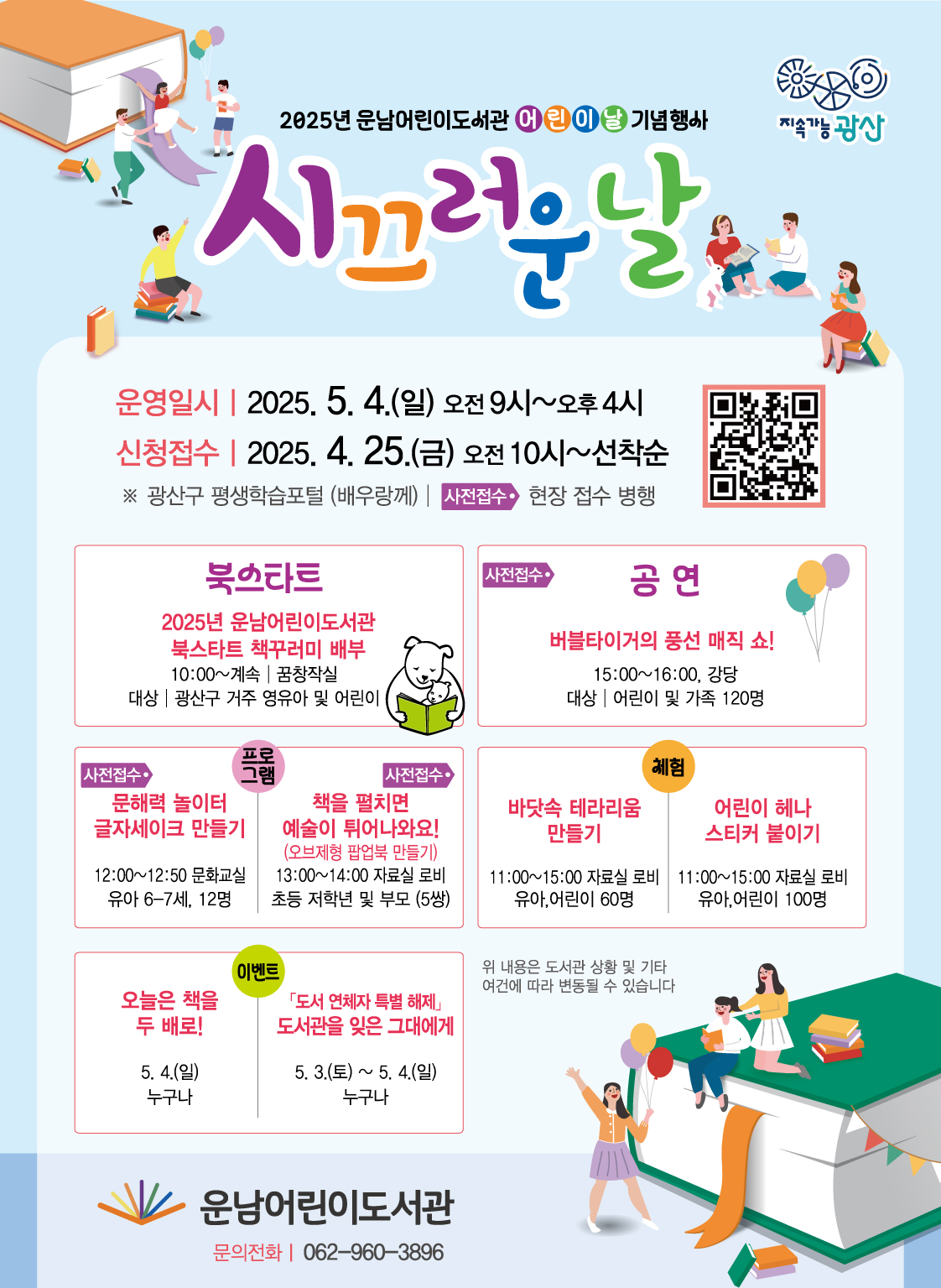 [특별프로그램②] 책을 펼치면 예술이 튀어나와요! o 일 시: ‘25. 5. 4.(일) 13:00~14:00(60’) o 대상/장소: 초등1~3학년 및 부모(5쌍), 10명 / 문화교실 o 강 사: 정다운 o 내 용: 책의 다양한 형태와 예술성을 경험해 보는 오브제형 북아트 (팝업북) 만들기 운남어린이도서관 어린이날 기념행사(5.4.)에 많은 참여 바랍니다. (행사 당일 어린이날 기념행사 진행으로 다소 소음 발생, 혼잡스러울 수 있습니다.) *풍선 포토존이 자료실에 마련될 예정이오니 예쁜 사진도 찍으세요~! |