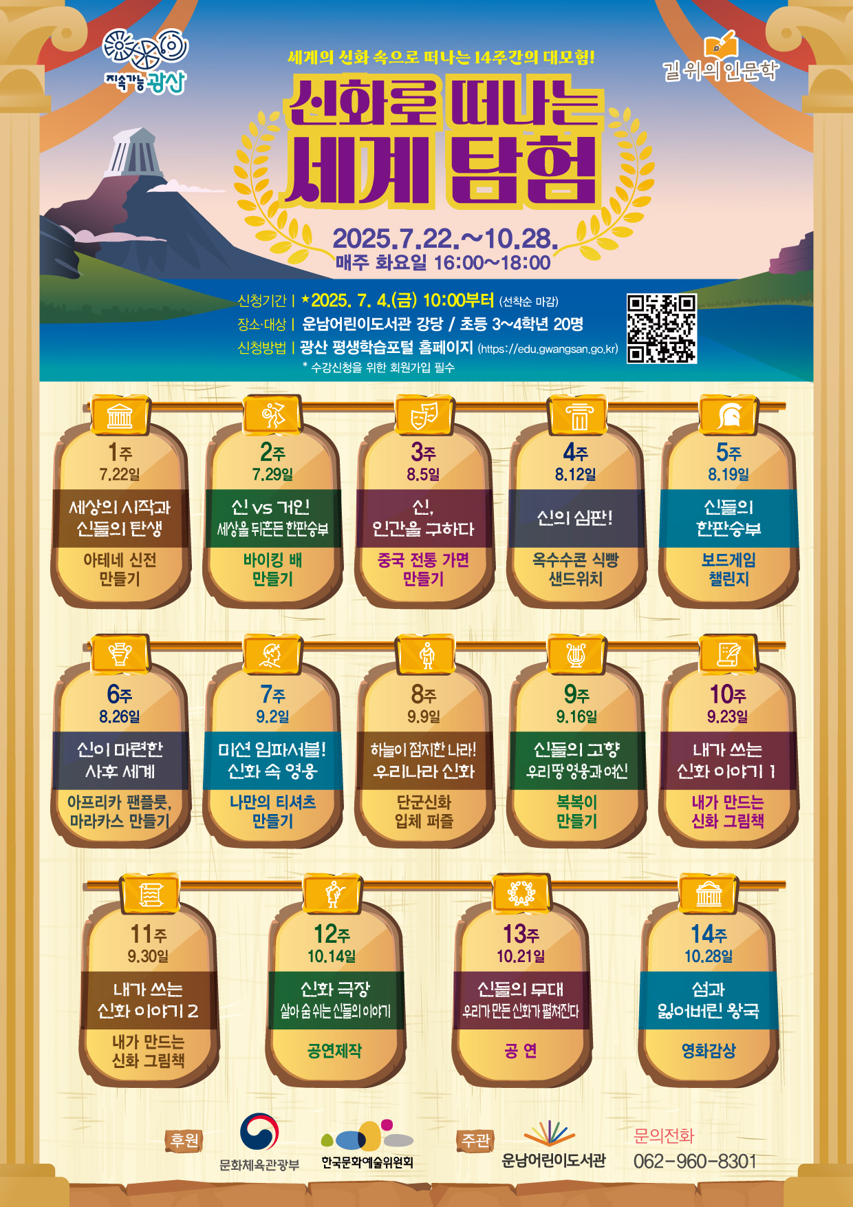 ◾요일/시간: 화요일 16:00~18:00 ◾기 간: 7. 22. ~ 10. 28. (14회 운영) ◾장 소: 강당 ◾강 사: 유명희, 한승진, 조유경, 김순영 / 신성란 ◾대상/인원: 초등 3~4학년 / 20명 ◾내 용: 신화를 통해 사고력과 상상력을 키우는 어린이 인문 교양 프로그램 ※ [안내] 어린이 수강생 개별 회원가입이 어려워 보호자 명의로 등록되는 경우가 많아, 정원(40명) 두 배수로 접수 인원 입력되었습니다. 실제 교육 인원은 어린이 20명 기준으로 선착순 모집되며, 20명 모집 시 자동 마감됩니다. ※ 이 프로그램은 문화체육관광부 및 한국문화예술위원회의 <2025년도 길위의인문학> 사업을 지원받아 제작, 진행되었습니다 |